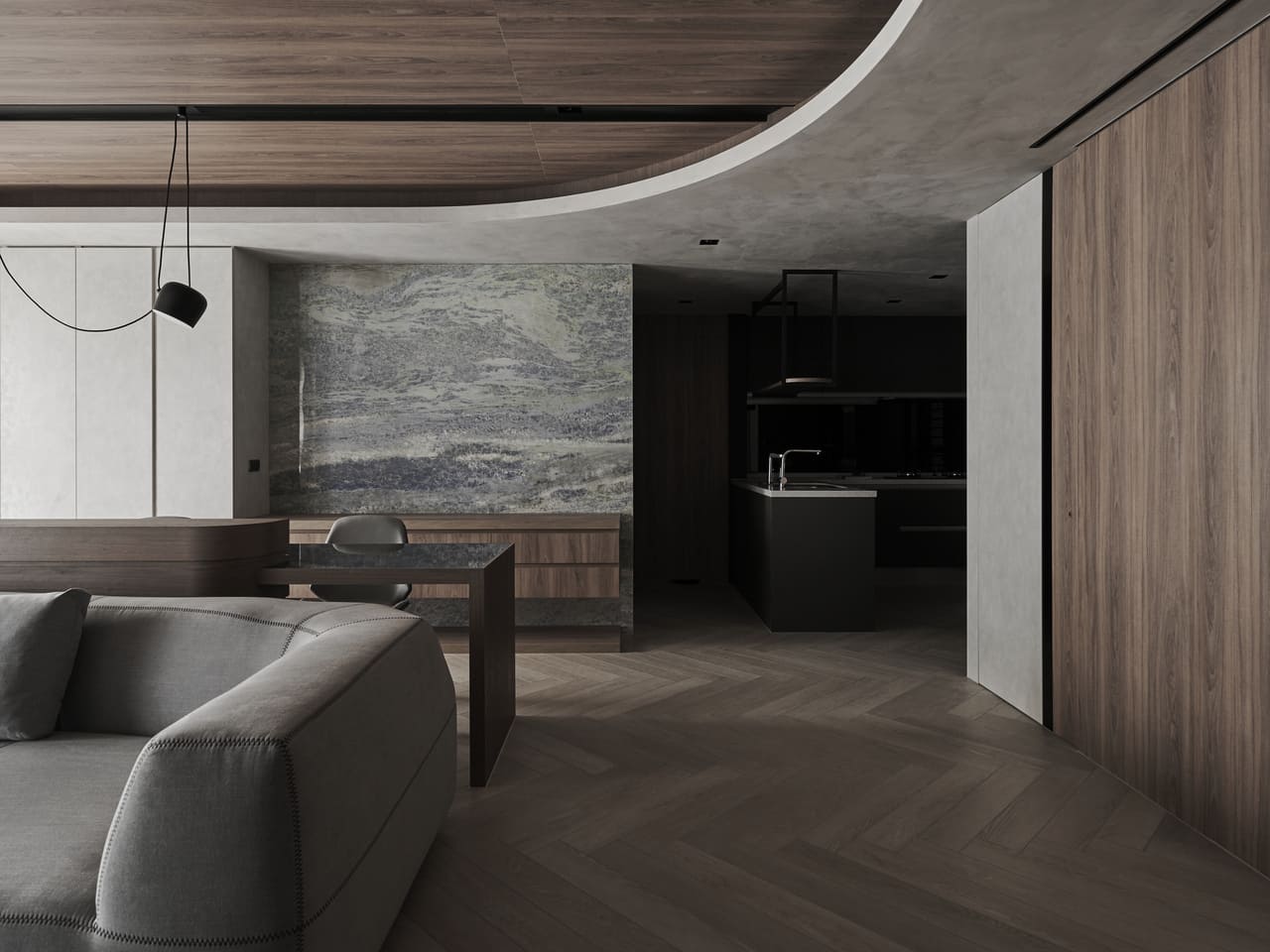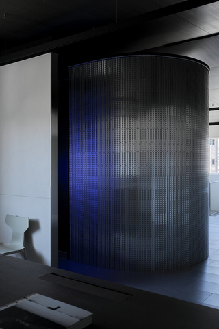 相較於七樓的溫潤,八樓的設計則轉向更為內斂、神秘的調性,呂世民說道,業主希望在氛圍上拉開差異,強化場域層級和使用屬性的辨識,讓決策跟討論得以在更沉靜的環境中開展。