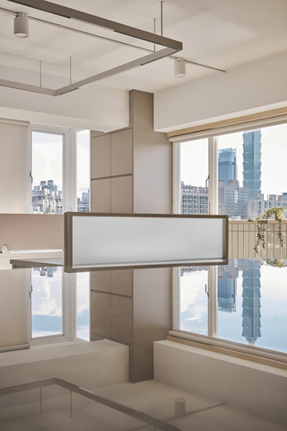機能完整的中島吧檯茶水區作為同仁交流的節點,也是極具畫面感的場景核心;考量天花板高度有限,七樓多採露樑處理,並飾以鏡面不鏽鋼包覆大樑,讓結構「消失」於反射中,增添一抹現代銳利氣息。另一方面,由於基地鄰近國小,視野開闊無遮蔽,窗外光線與城市輪廓順勢成為空間的一部分,甚至能眺望台北101,讓工作日常多了一層向外展開的呼吸感。