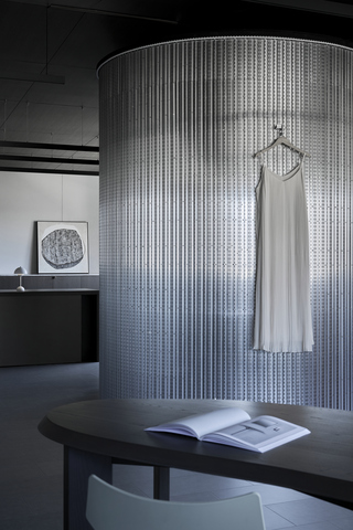 其中,最具象徵性的設計在於廁所空間的處理。設計師大膽地將廁所以圓形量體呈現,外層包覆由「重柱五金」為概念發展的金屬皮層,這些原本用於服裝產業承重及陳列的五金元素被轉化為獨具張力的表情,同時亦保有實際機能,可懸掛衣物、搭配造型,緊扣品牌發展歷程。金屬表面隱約反射的光線搭配藍色光源的點綴,營造出帶有時尚及科技感的韻致,並與天花板木質立面的溫潤形成對比,使空間在冷靜和感性之間和諧交融。