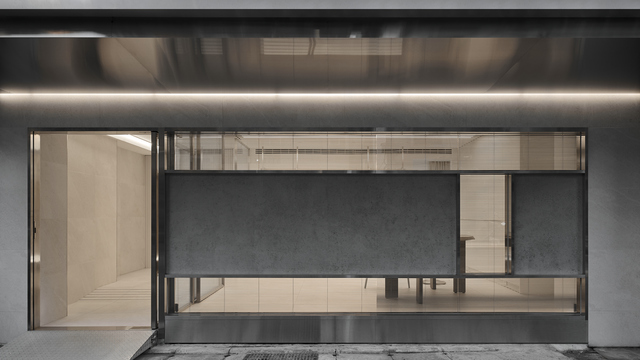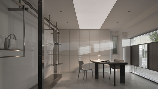 原先辦公室位於一樓倉庫內,較顯封閉壓迫,是業主亟欲改善的狀態,因緣際會下,他購入了同棟的七樓與八樓,整體機能得以重新分配:一樓增設線下體驗區域以及純倉儲,七樓作為同仁辦公空間,八樓則規劃為管理層使用的獨立樓層。作為品牌對外最直接的介面,一樓新增預約制的體驗據點,考量基地臨路、人流頻繁,在設計上刻意避免全然通透的櫥窗形式,而是嘗試在開放和隱密之間取得平衡。室內色彩維持高度克制,以乾淨、明亮的基調襯托產品,使其躍為視覺焦點;而光膜的運用則映照出均質而柔和的亮度,從街道望入可隱約感知內部動靜,又不至於一覽無遺。