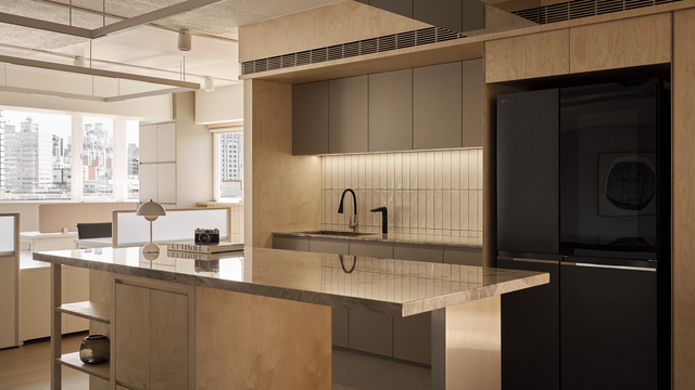 七樓被設定為年輕、開放、從容的工作空間,設計上大量運用樺木夾板作為牆面和櫃體基底,搭配暖色調材質及經典家具,營造出好似在咖啡廳工作的氛圍,讓同仁能獲得視覺與心靈的放鬆,也便於拍攝或直播時取景。