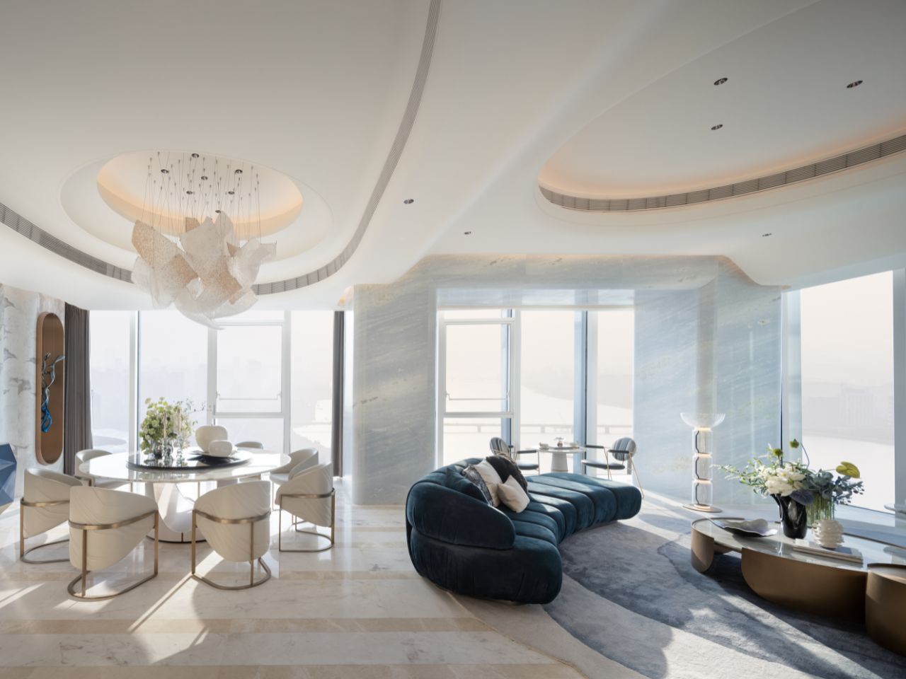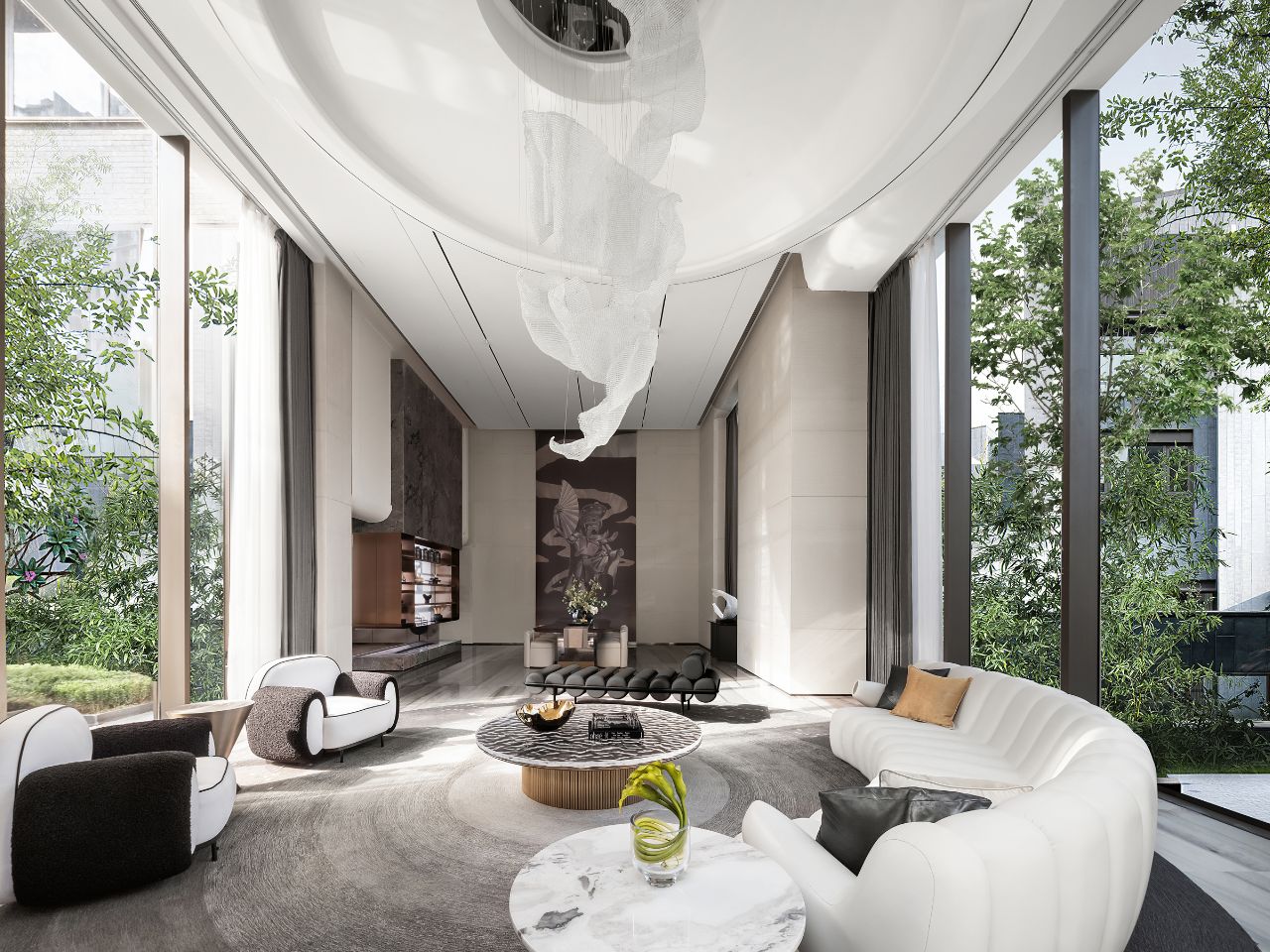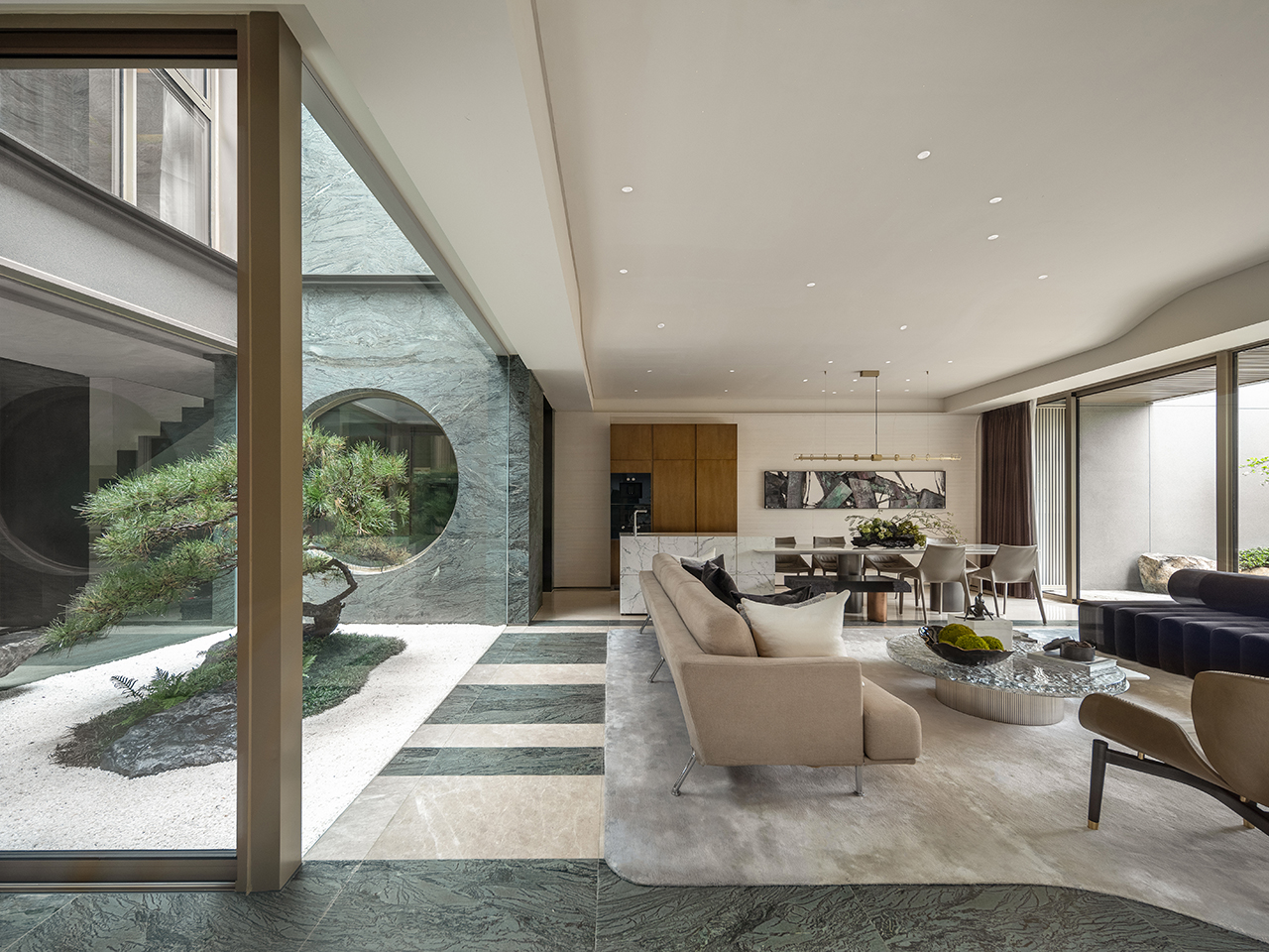 設計靈感以得天獨厚的周圍環境與當地文化為核心,如故事篇幅般層層展開。首先是「面河傍山」的絕佳景致,浩瀚水岸與翠綠山巒成為空間中的自然畫布;地下一樓的天井設計引光入室,將自然光化為動態的藝術筆觸,形塑「半畝方塘一鑑開,天光雲影共徘徊」的詩意畫面。設計團隊秉持藝術共生的理念,巧妙運用富有美感的天然石材,鐫鑄雋永品味,在奢華中回歸本質,讓生生不息的家族日常,成為最美的生活景畫。