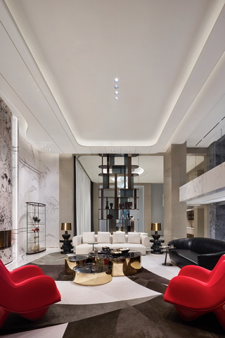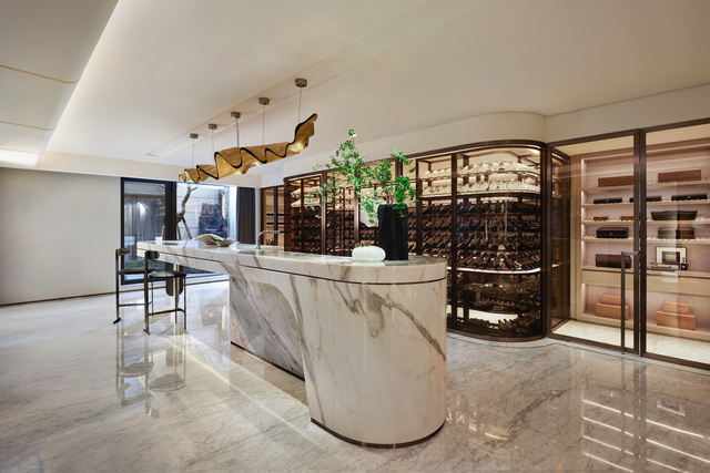 全作運用天然奢石紋理作為藝術主軸,搭配隨時間勾勒不同情境的光影,詮釋富含東方意境的現代設計,並將軟裝家具與隱性收納細膩融入整體敘事,例如地下一樓的展示架,既是區隔場域的藝術裝置,亦是可作收納的機能牆,呈現含蓄的當代美感,共築「可居住的美感」,讓藝術於日常中自然演繹。