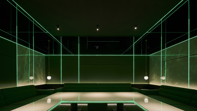 綠色包廂瀰漫著科技感與神秘氣息,黑鏡材質延伸至上牆及天花,線性燈帶穿梭其間,形塑彷彿科幻電影的光影世界。