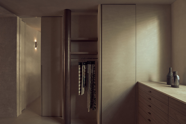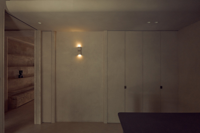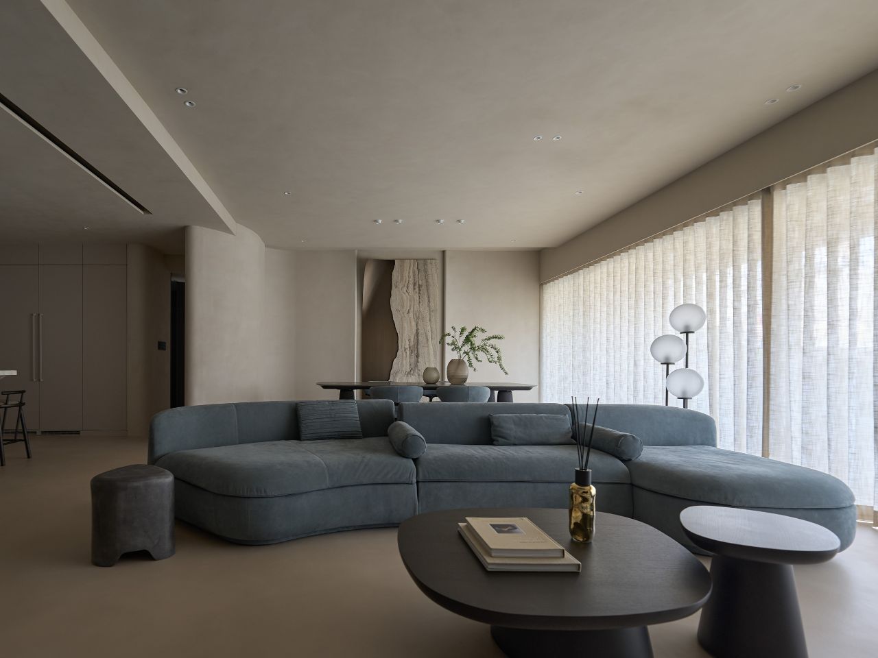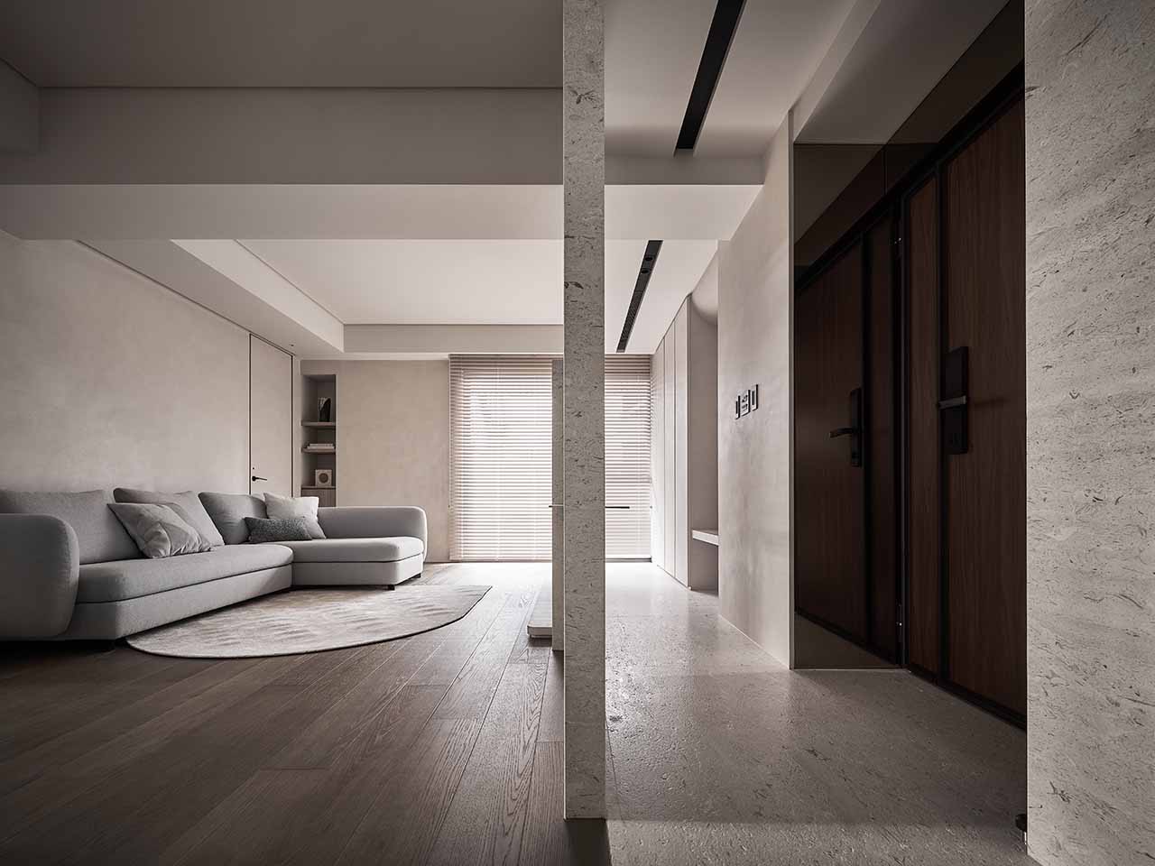 入口玄關是空間給予的第一印象。一道略轉斜角的大門,創造一個含蓄的視覺轉折,避免室內一覽無遺;廊道兩側對稱的圓柱以溫潤弧線迎接訪客,從伊始便奠定空間的柔和語彙。設計師以相同色系為紙,不同質感為墨,在此展開靜謐的層次敘事。大理石的天然紋理與凹凸肌理,與一旁質樸塗料牆面形成微妙對話,塗料自有其細膩肌理,然而色澤更顯純粹內斂,沉澱了初入空間的心緒。這種以材質紋理取代色彩變化的邏輯,在此處延伸至每個角落。