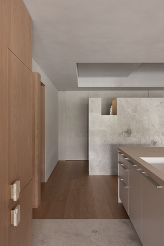 整體氛圍以女主人的性格為核心發想:重視品質、含蓄而不張揚,有鑑於此,質感並非來自複雜語彙的堆砌,而是一種對極簡明快的追尋。材質鋪陳回歸節制,避免過度裝飾,利用塗料、淺色橡木與安卡拉灰大理石作為主要基調,石材凹凸紋理細膩、深淺適宜,遠觀不喧嘩,近看富含韻味;而業主偏好的「金色元素」則利用黃銅進行詮釋,隨著時間氧化的過程逐漸映照生活痕跡,成為室內低調卻耐人尋味的表情。