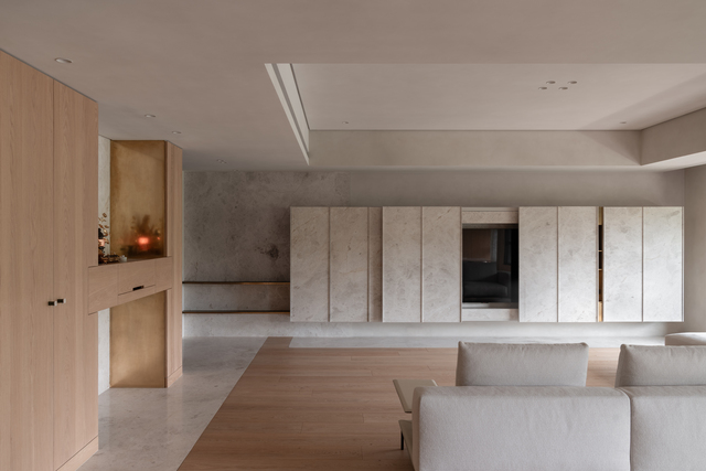 細節處亦可窺見縝密細膩的設計思維,櫃體把手的石材經鑿挖、倒角等手法處理,再與黃銅跟皮革混合運用,使構件成為內斂卻精準的節點。電視牆部分則必須兼顧神明廳的使用和公區的視覺完整性,因此,特別採上下懸浮的立面形式,結合電動五金系統;施工過程得反覆校正受力點同時盡可能削薄材料重量,讓畫面得以在靜止與啟動間轉換自如。