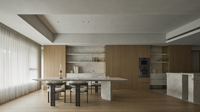 而神明廳則是全案最關鍵的轉折,設計師刻意避開傳統神明桌的制式型態,改以櫃體與牆龕的方式回應需求,並在符合文公尺的前提下微調抽屜比例,讓量體更和諧地融入空間中;同樣以木皮、大理石與黃銅作為構成的主要語彙,使其自然嵌入公區中,不僅託付了信仰,更象徵家族情誼的連結起點。設計師說明,牆龕的意象被延伸至如電視牆、中島和半高櫃的內凹造型中,形成一種隱約的結構關係,材質的轉折層次讓分屬不同機能的量體在視覺及比例上亦能相互對話。
