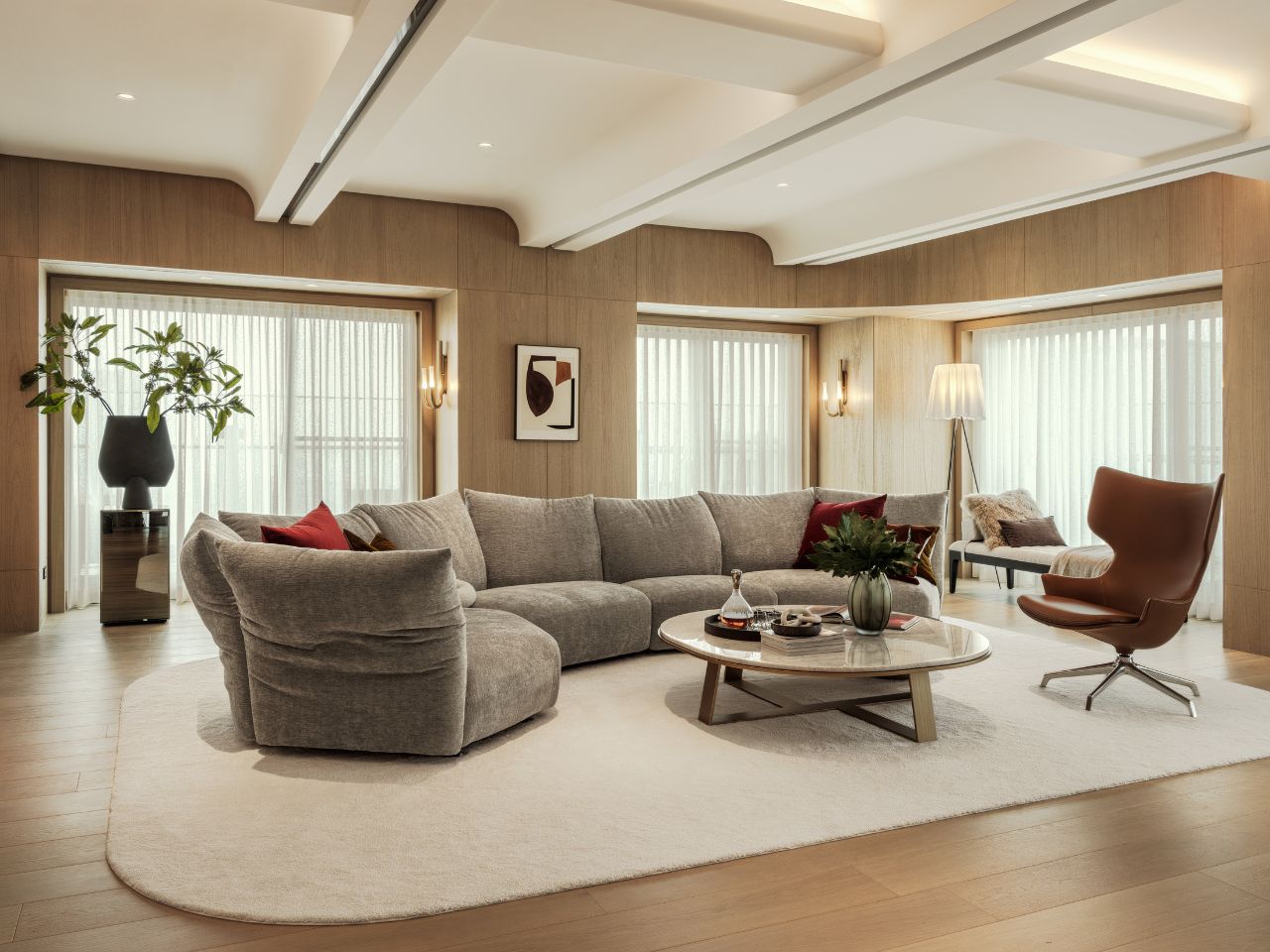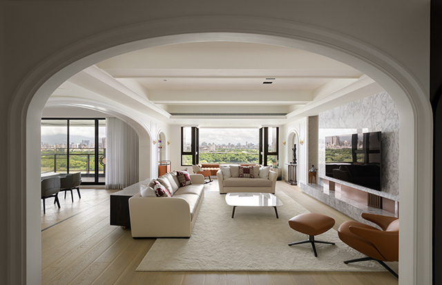 客廳融合現代簡潔與古典韻味,透過連續弧型拱門與層疊天花線條,柔化建築結構,並將窗外河景綠意,如畫般納入空間。