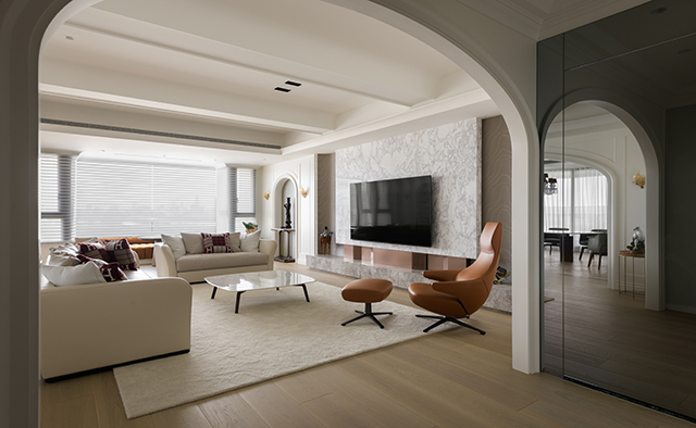 客廳作為家的核心,融合了「現代」的簡潔與「古典」的韻味。連續弧型拱門與層疊天花線條,柔化建築骨架,並將窗外的河景與綠意,如景畫般納入空間。電視牆選用紋理如潑墨的山形大理石,其渾然天成的氣韻,與整體柔和的米灰色調和諧相融。白日,天光透過落地窗滿溢室內;入夜後,嵌燈與間接光源交織出溫潤光影。家具選用線條簡練的皮革沙發,而電視牆下方一道整合線路的古銅色金屬細槽,則將機能收束為精緻細節,體現美學與實用的並存。