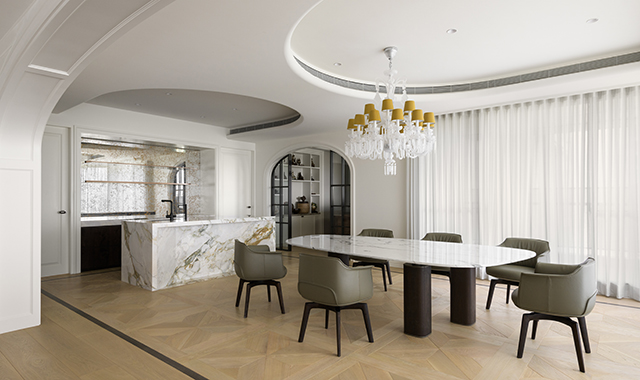 餐廳以圓形天花與水晶吊燈呼應拱形主題,勾勒凝聚感,佐以石材與魚骨拼木地板共築溫潤基底。