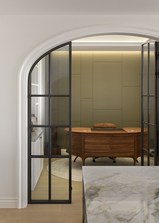 餐廳延續拱元素,圓形天花與古典水晶吊燈,凝聚空間的向心力,搭配天然石材中島、餐桌與魚骨拼木地板,溫潤界定場域。光,在這裡扮演要角,水晶燈灑下璀璨輝光,展現隨情境變幻的多變氛圍。空間中最動人的巧思,在於餐廳後方那面以黑色細鐵件勾勒的拱形玻璃櫥窗,不僅是藏酒櫃,更特別為男主人規劃一處宛如神龕的展示空間,讓其虔誠收藏的宗教藝術,與日常的杯盞光影靜靜對話,使精神信仰成為生活中最自然、也最高貴的風景。