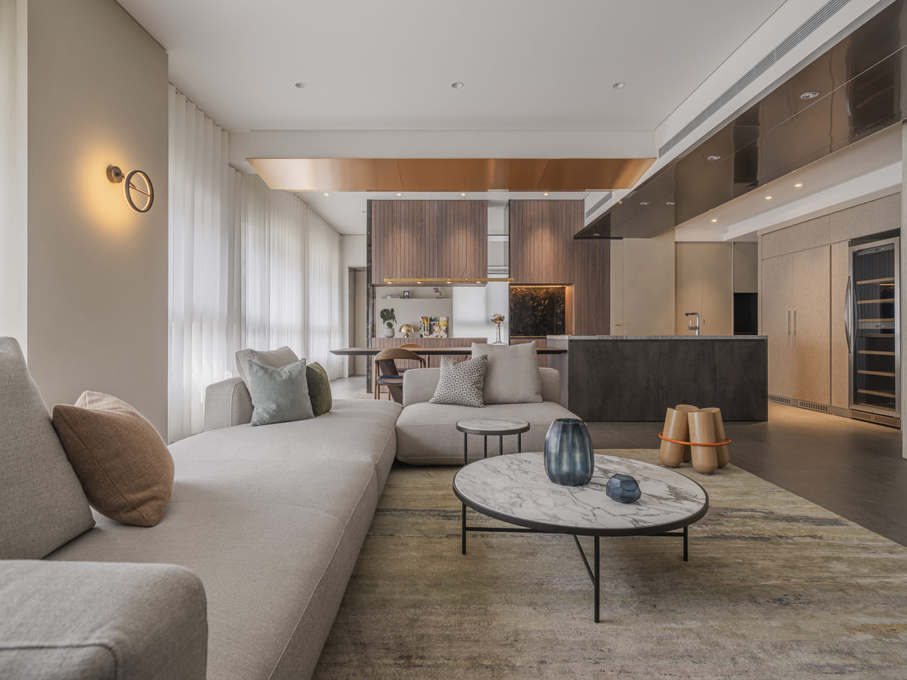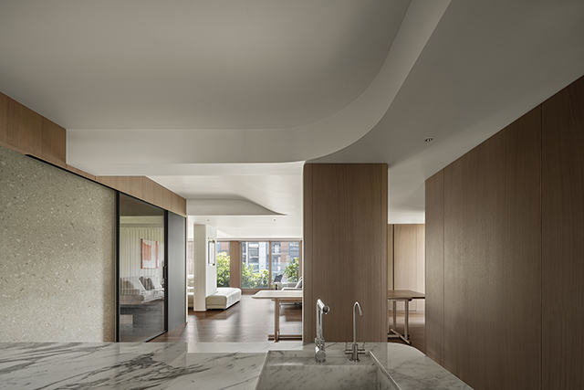 餐廚之間透過承重柱立下不完全隔斷的分界,木飾面的包覆與旁側的牆面彼此和諧。