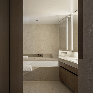 衛浴洗手台的鏡面,與用於置物的櫃體以及凹槽共構多維空間結構,輔以內嵌燈條,利用光影的對比加強畫面層次。