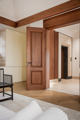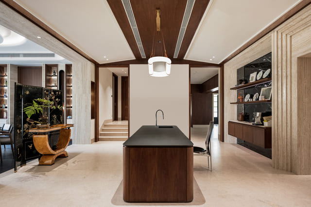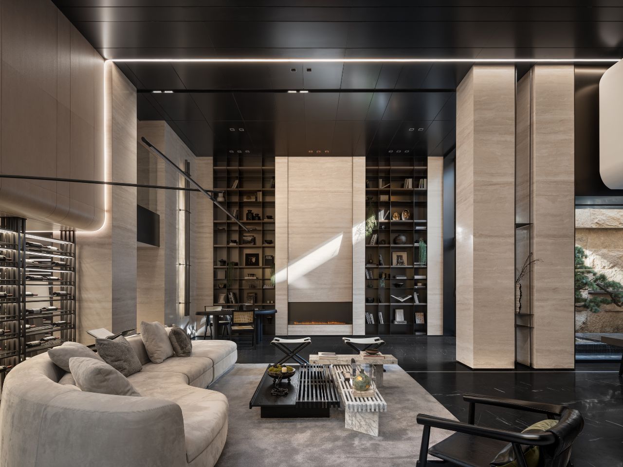 公共區域的空間營造尤為注重東方意境的表現,融合木質、石材與金屬用材,在質感對比中取得平衡,並透過開放與圍合的交替,使空間關係既具社交屬性,也保留靜謐餘地。整體設計不以風格標籤為導向,而是藉由光線、動線與場景轉換,營造出層層遞進的空間敘事,使居者在日常行走之間,自然沉浸於空間情境之中。