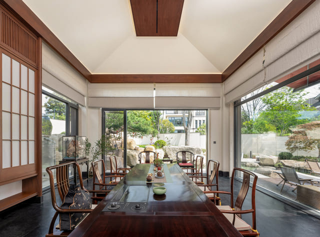 茶廳周邊環繞大幅落地窗,映入室內的庭院景色與富有人文氣息的茶席相映成趣,宛如自然展開的四季畫卷。