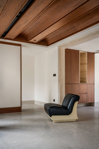 原始建築房樑結構錯綜複雜,高低錯落、局部密集交叉,對天花造型設計構成顯著限制,設計師因應結構條件,採取封平低區、保留高區、隨樑做邊與局部挑空等多元策略,使天花成為樑體結構的自然延伸,不僅弱化高度差所帶來的壓迫感,也在視覺上增強空間縱深。天花線條隨著場域功能的轉換而變化,使結構語彙融入整體設計邏輯,將限制轉化為塑造空間層次的重要媒介。