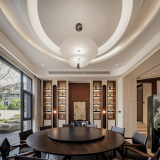 全屋動線設計以東方園林「移步換景」為基本理念,圍繞居住者的行為軌跡與空間意境展開。設計師將樓梯間設置於一樓中央,作為垂直交通與空間轉換的核心節點,延伸西餐中島吧台與西廚烹飪區,串聯平面分區,使動線自然輻射至各個公共場域。由此向外展開簡潔的西式餐廳、開放客廳、繁複華麗的中式餐廳與茶廳,以及客房與配套衛浴等等機能,形成層次豐富而節奏分明的生活場景。
