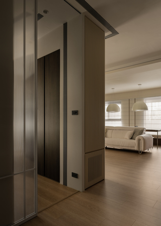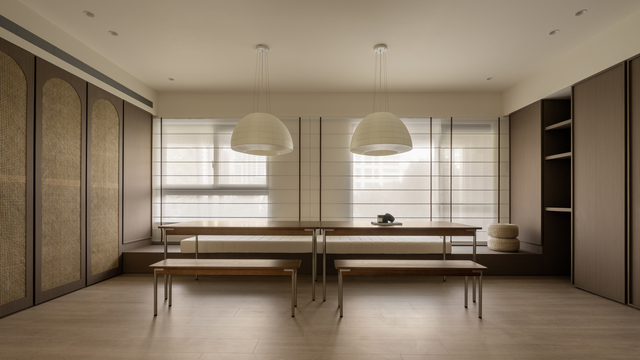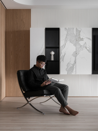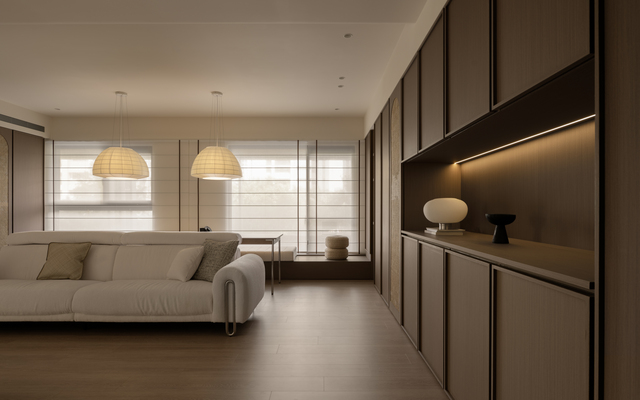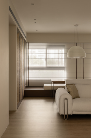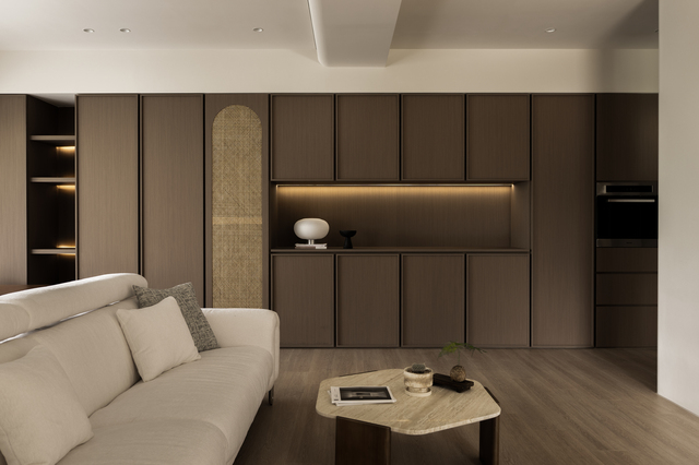 設計上以「韻」作為線索,並非以抽象概念詮釋,而是藉由身體在空間中的感知逐步累積。木作門片細緻的線性雕刻和材質轉換形成豐富的立面層次,藤編恰如其分地出現在門片或櫃體局部,在現代簡約的結構中留下一抹人文溫度,鋪敘含蓄而內斂的氣息。自然光沿窗入室,經由柔光窗簾過濾後徐徐散開,如同墨色在宣紙上暈染般,溫潤不張揚;局部點綴的弧形元素令光線在不同介質間流動和轉折,堆疊細膩的明暗變化。