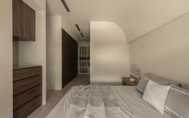 主臥上方的樑柱以簡潔手法化解厚重感;弧形天花一路延伸至牆面,兼具床頭機能。
