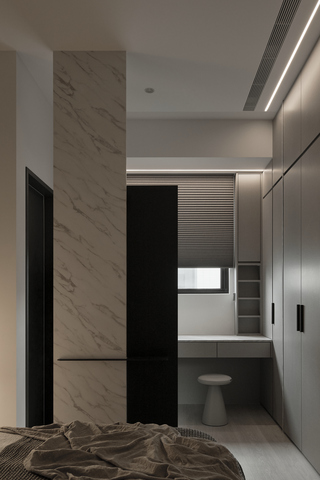 主臥梳妝台與寢區之間置入大幅鏡面和長條隔板,結合實用性和美觀紋理,營造視覺的轉折,豐富臥室層次。