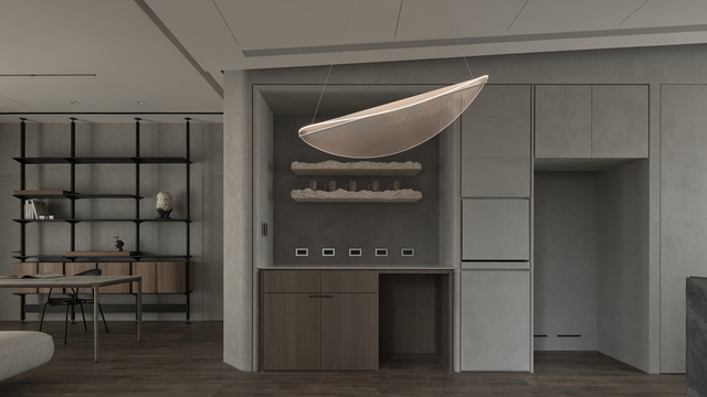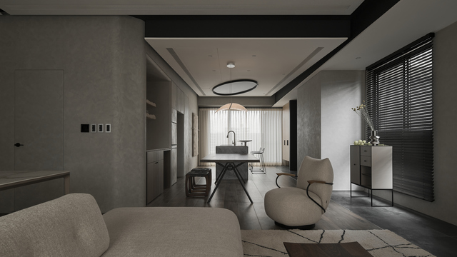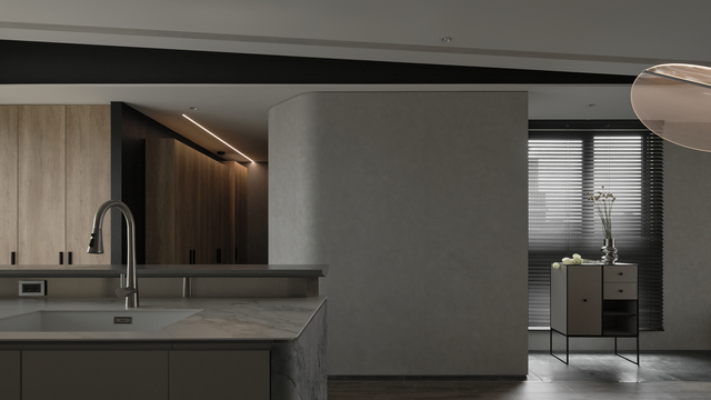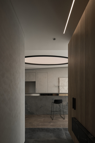 這座住宅的機能安排著重收納,整合牆面與櫃體系統,如玄關設置大面積收納櫃,滿足日常出入的快速整理需求;男主人熱愛烹飪,入門動線自然轉向內廚,隱藏門設計平衡廚務繁複與公共區整齊視景。餐廚區以中島為核心,光膜提供均勻明亮的工作照明,餐桌上方吊燈與茶水酒櫃燈帶營造溫暖氛圍,四盞投射嵌燈則補足料理與備餐的實用光源。