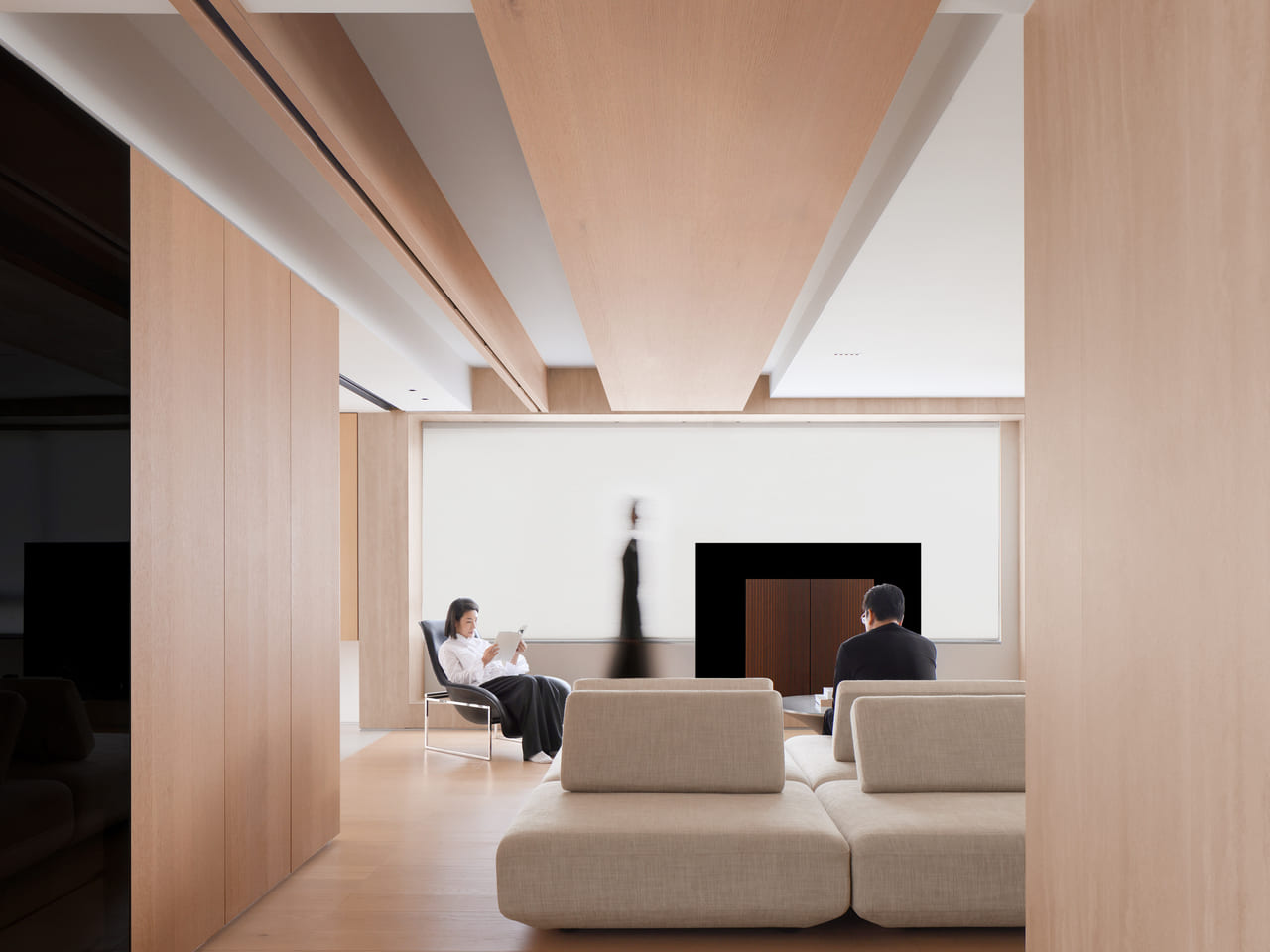 為更立體地支撐與呈現岩板質感,設計結合木作打造多樣家具量體,如長桌、座椅、洗手台、階梯踏階等,散布於不同場景之中,這些木作結構宛如立體拼圖,與具雕塑感的空間形體相互呼應;此外,岩板紋理與木材自然色調亦成為空間中唯一鮮明的色彩層次,營造出低調而富深度的感官體驗。