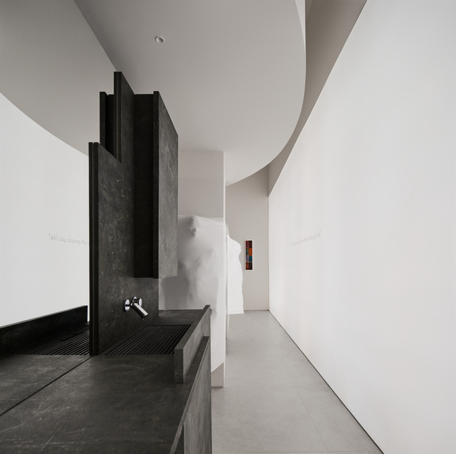 將岩板堆砌的洗手台置於展間中心營造洄游動線,宛如美術館展示雕塑,以便來客自不同角度欣賞和使用。