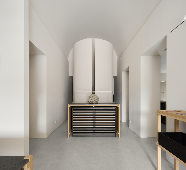 過道亦被巧妙轉化為產品藝廊,使每一段行走都成為觀看與觸摸的延伸,房樑系統經過細緻處理,結合天花高低變化與局部拱頂形式,依據不同展間塑造多元氛圍,種種細節不僅回應建築原始條件,也豐富空間層次,使各展廳在統一質材語境下展現差異。
