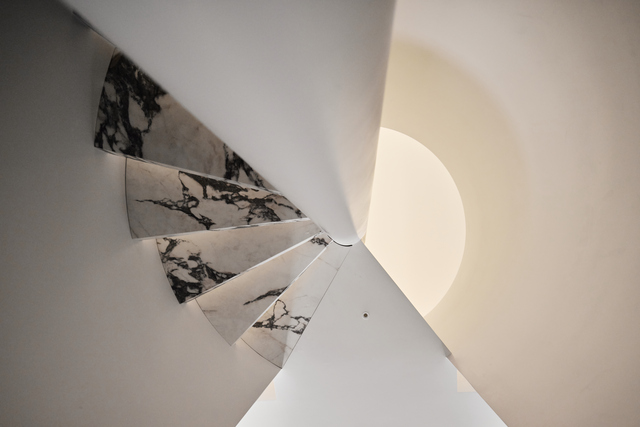 空間以貫通上下樓層的螺旋梯為中心,圓柱外牆和曲弧與周遭規正的布局互襯線條張力,透過造型和串聯各區的核心位置聚焦來賓視覺。