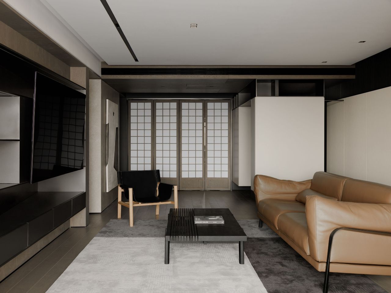 深入私人領域,以一間客衛浴作為迎接和淨手儀式,腳步轉向旁側的兒童區,以置物架牆面為主體,結合地台設計,既提供閱讀與遊戲的場域,也清楚界定幼兒活動範圍。主臥則位於最深處,透過黑色隱形門與層層櫃體過渡,強化私密性;室內採半開放配置,以透光隔柵分隔寢區與衛浴,讓自然光得以深入,維持整體的通透與柔和。