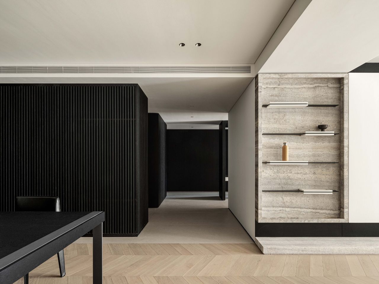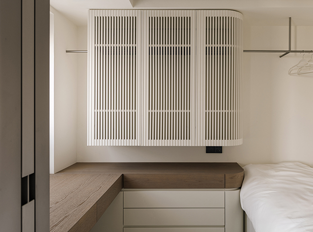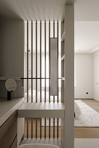 主臥梳妝台通過牆面轉角和格柵式屏風與寢區相隔,平衡功能性分區和採光流動。