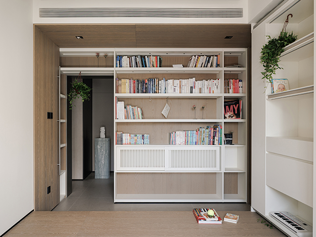設置於私人區域的多功能小廳,透過置物架與牆面的結合,結合收納及分區,串連不同臥房的出入和互動。