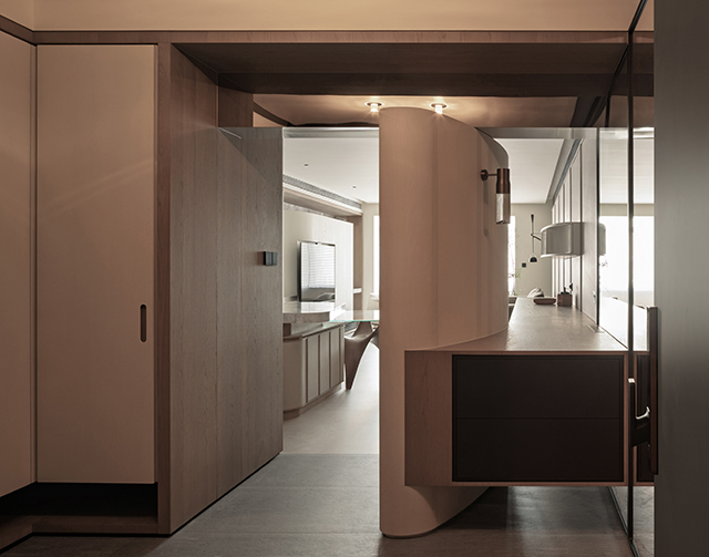 玄關結合半個衣帽間的功能,懸浮櫃體不僅提供平面放置物品,也和弧牆形成部分遮蔽,以免剛入門即望穿整體公共區域。