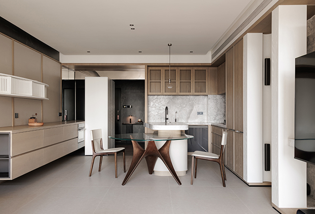 餐廚空間緊鄰玄關展開,沿牆配置洗手台、烤箱與灶台,形成高效的工作動線,中島吧台與圓形餐桌構成空間核心,縮短備餐與用餐之間的距離,也讓家人在日常忙碌中維持交流的可能,長型邊櫃與連續地坪則引導視線與步伐,自然過渡至客廳。