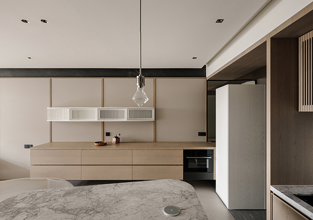 長形櫃體銜接餐廚區和玄關之間的過渡,同時結合收納功能和展示平台,巧妙定義空間秩序。