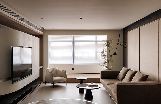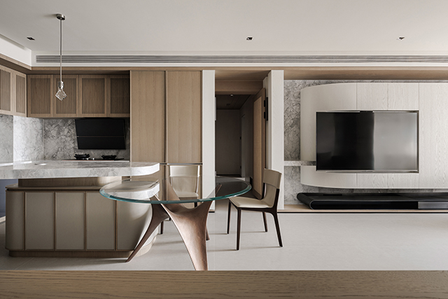 餐廚區突出的櫃體與客廳弧形懸空電視櫃,打破長形空間的單一線性,黑白石材的底襯鋪陳則在視覺上形成呼應,使不同區域彼此產生連結,這些細節如同山石之間的自然起伏,讓空間在整體一致中保有豐富層次。