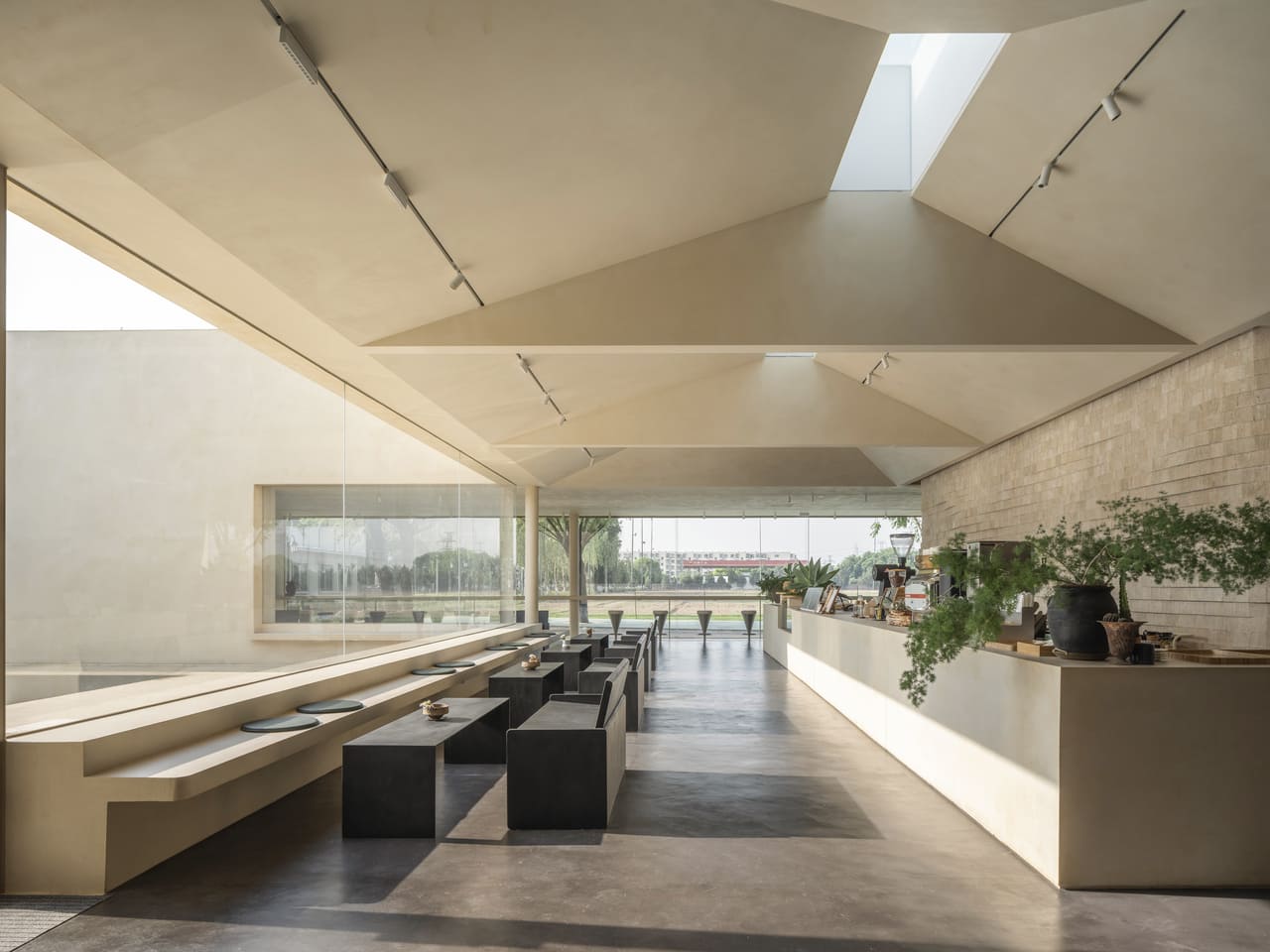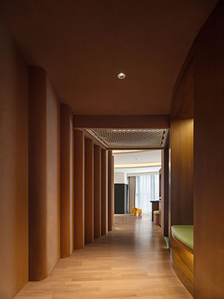 玄關立柱的弧度引發林間樹木排列的聯想,旁側挖空,提供入住者放置行李或坐在軟墊上更換鞋襪。