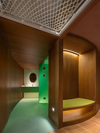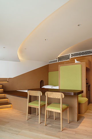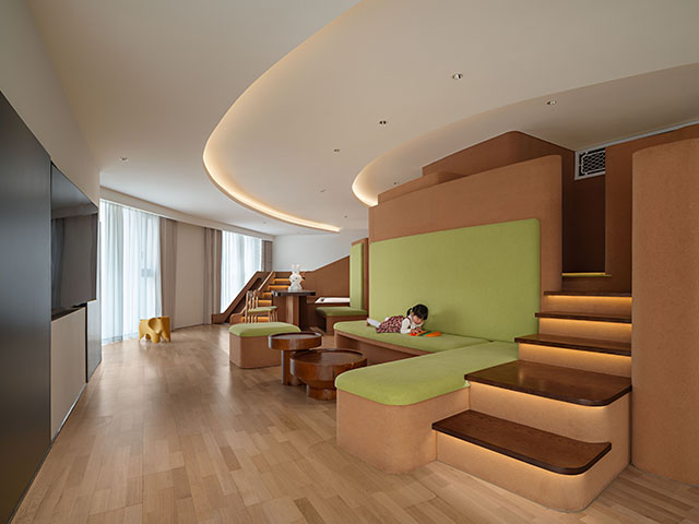 體貼幼童的活動,每個量體和家具的轉角均呈現打磨圓潤的弧度,淺色木質基底疊上草綠軟墊,帶來自然環境的聯想。