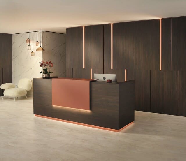 當飾材運用於商業情境,也是品牌印象的無聲載體。講究長時間的視覺平衡與觸感品質,也追求環保、耐用、容易清潔維護。從牆面到檯面、從端景到櫃體,表面處理的細膩度、色澤與比例的拿捏,靜默傳達企業精神,在身影穿梭往來之間,銘刻屬於場所的記憶氛圍。