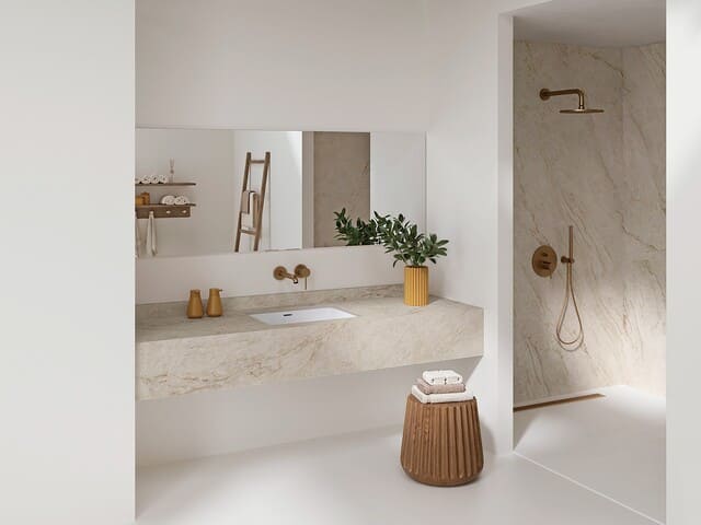 居家的飾材選擇,鋪陳出生活的溫度和節奏,讓外觀視覺的統一協調,在日常使用中堆疊細膩體驗。腳下的地坪、指尖滑過的檯面、日光映照的牆面,都是生活質感的延伸。晨間梳洗的衛浴場所,以耐濕易潔的飾材為基底,點綴自然色階與柔霧質地,在洗淨和放鬆間感知優雅與平衡。具備抗菌、防霉與抗磨刮性的板材,更能兼顧長時間的使用品質,讓潔淨與美感一同留駐。