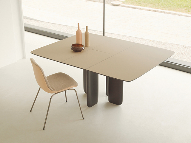 Molteni&C的 Louisa,由Vincent Van Duysen 設計。一系列的圓形和橢圓形茶几,採用實木、混凝土材質製成,富有創新的觸感和美感,以不同大小與高度堆疊層次美感。底部以圓柱形基座彷彿大樹從地面長出,支撐桌面如懸浮的托盤,讓空間產生輕盈優雅的現代美感。(卡希納空間美學)