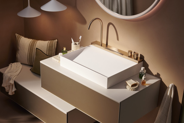 「Avalegra出水面盆」以一體成型的設計,將面盆與龍頭自然銜接,體現簡約而優雅的外觀輪廓。