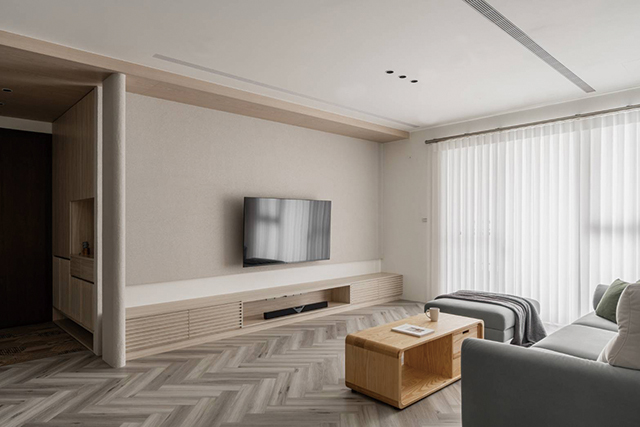 電視牆以Jolypate塗料塗布,以柔霧光影延伸空間尺度。