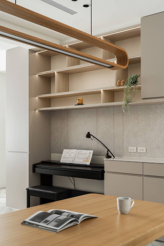 客廳與餐廳之間的過渡區域,是別出心裁的藝文空間,滿足小孩練琴的需求,也是書櫃收納的閱讀角落。鋼琴和餐櫃規劃於同一平面,有效運用格局中央的開放區域。上方以開放式層架搭配封閉式櫥櫃,兼顧展示收藏與餐廚收納的需求,餐櫃平時則擺放咖啡機或準備輕食。