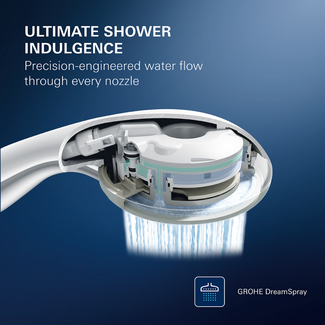 DreamSpray夢幻花灑技術是GROHE淋浴系統的靈魂。透過內部水流的均勻分配,確保每一個噴嘴孔輸出的水壓完全一致。無論您選擇的是柔緻舒緩的雨淋模式,或是具按摩力道的強勁噴射模式,都能感受均勻、飽滿的水感包覆。