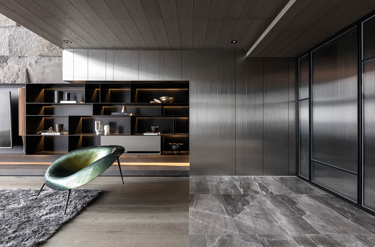 運用威盛亞裝飾板,不僅讓異材質搭配更隨心所欲,同時也讓設計想法有更多可能。高培育說:「天然石材要大面積的掛在梁上,承重和固定會比較挑戰。運用仿石材的裝飾板,可以更自由的表現」。兩人笑說,原先業主也擔心選擇深色石紋會太沉重、有壓迫感,但最後證明這個選擇是對的,不僅空間更顯深淺層次,視覺上也更協調。