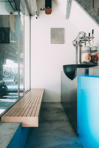 室內設計由「艸設計」的蔡昕倫設計師負責,以「氣泡」為靈感,重新詮釋府城街角的小坪數店面,讓有限的空間成為風味與體驗的延伸。騎樓地面嵌入訂製藍色圓形磁磚,象徵氣泡升起的軌跡,視線隨之一路延伸至室內吧檯,讓來訪者彷彿行走於氣泡之間。門面利用重疊造型的鐵框玻璃橫拉門打造,開闔之際LOGO會隨之分離與重組,猶如氣泡的相遇、分裂與擴散,創造場域和品牌間的互動。