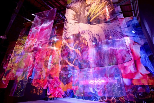 隨後,《綻放的情感》、《與光影共舞》等展區,逐步引領觀眾深入其核心美學世界。而台北站獨有的新增展區《生命的殘骸》,無疑是本次展覽的哲思亮點。無數印有巨大花朵的布幔自天幕垂落,層層交疊出盛放與凋零的殘影,行走其間,彷彿在鮮活的「此刻」與褪色的「記憶」中徘徊,優雅而深刻地展現生命與消逝。