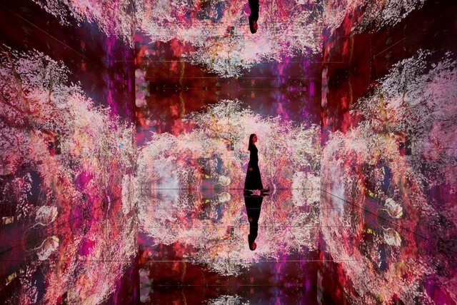 而於京都展備受熱議的《深淵彼岸的夢》,則帶來全然包覆的感官震撼:觀眾先被無盡怒放的絢爛花海擁抱,旋即步入由鏡面與巨型螢幕構築的720度無限全景空間。櫻吹雪、花火、律動海洋,場景永恆變換,使人徹底沉入一個超越現實的彼岸幻夢。